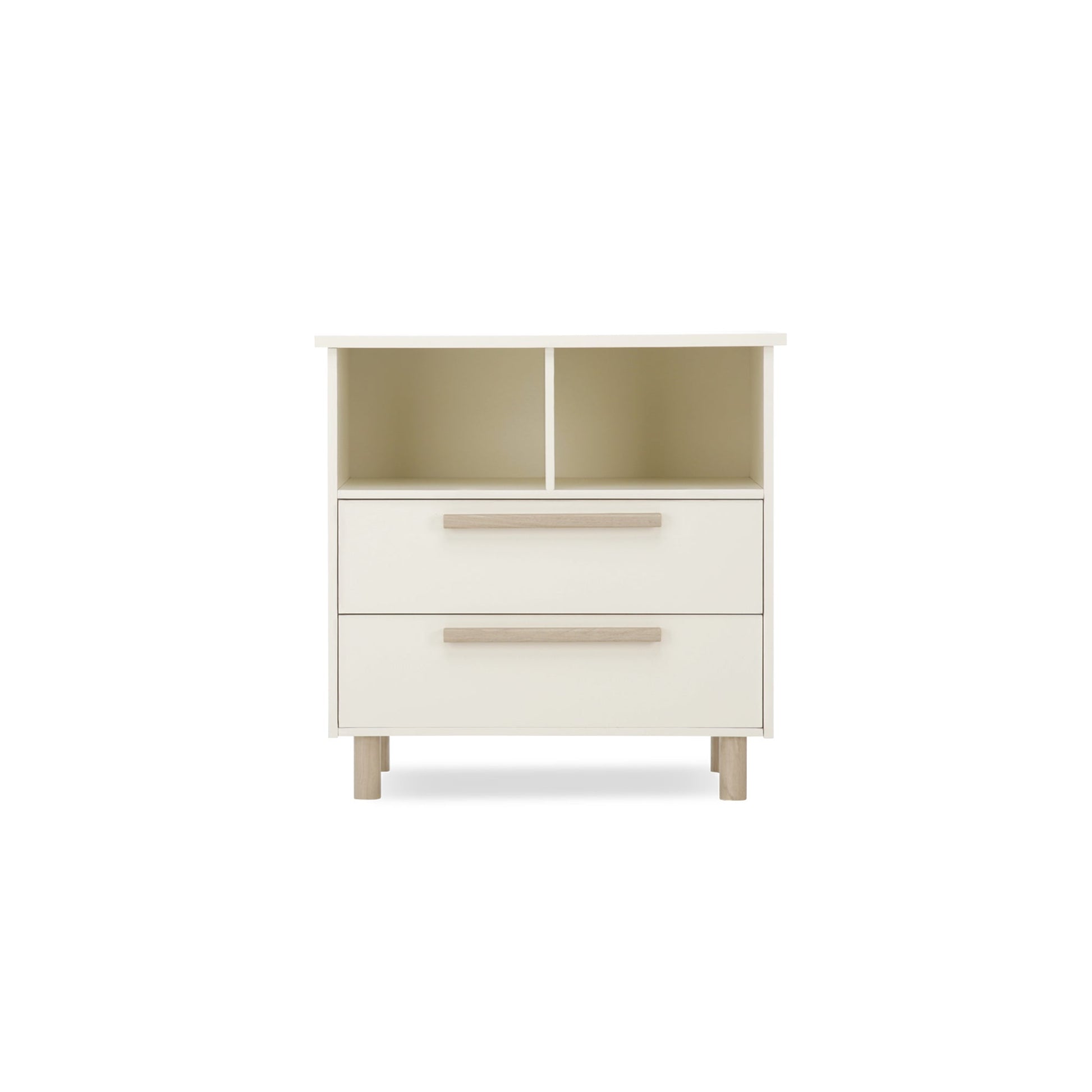 Combine style and function with the CuddleCo Harper dresser changer in your modern nursery. This dresser changer features soothing neutral tones in soft ash or cream to help create a calming environment. The drawers come with stylish contrasting handles to make it a contemporary staple. The Harper dresser changer provides stylish functionality with 2 deep drawers that open up to reveal generous space ideal for storing your baby’s changing items and extra clothes. The open storage shelf allows you to neatly store your changing essentials or decorative baskets on either side of the shelf divider. The top changer can be removed once you no longer need it to transition this piece to a stylish dresser for your toddler.
