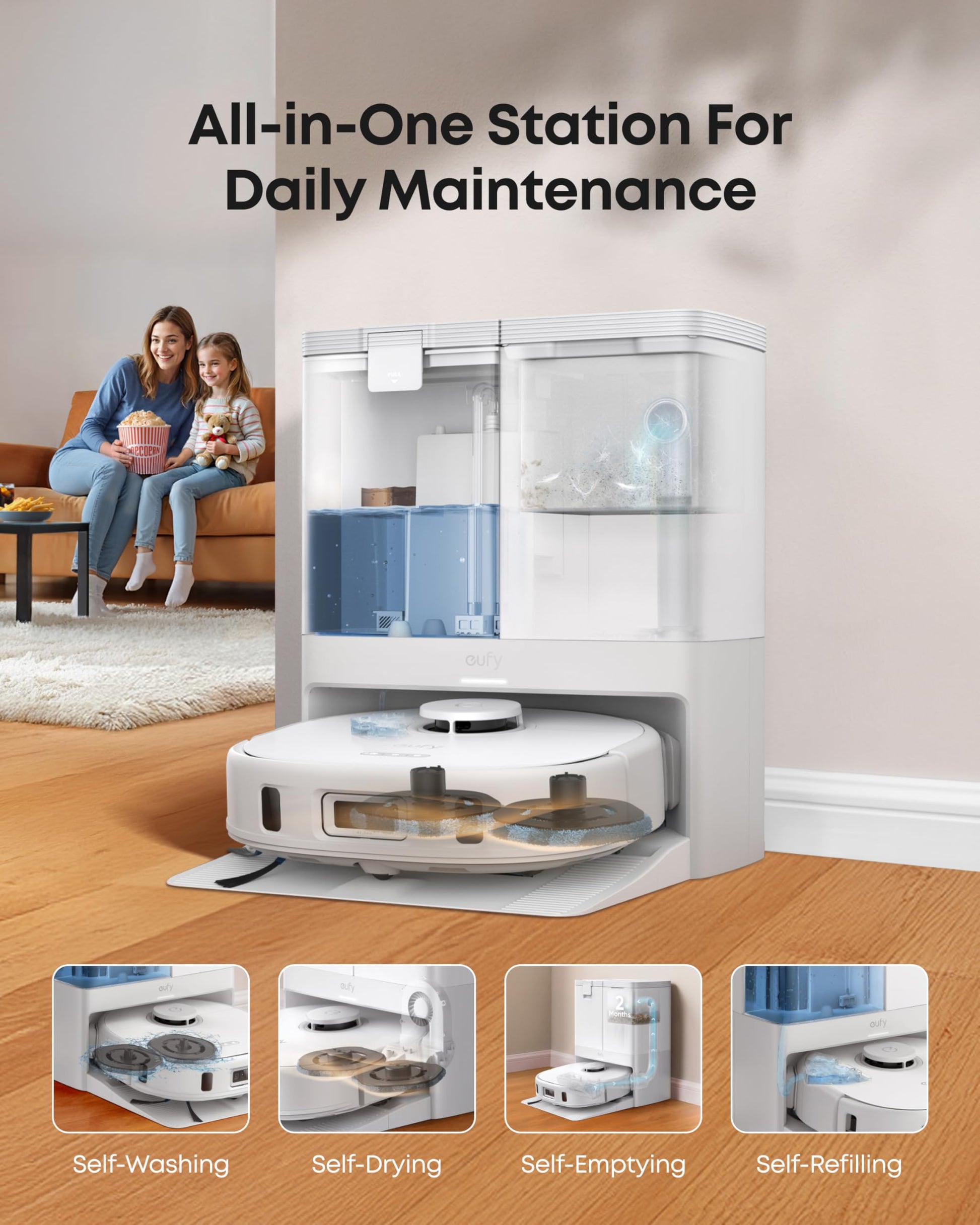 All-in-One Auto-Cleaning Station: Mop pads are automatically washed with clean water and dried with heated air. The 2.5L dust bag reduces maintenance, only needing replacement every two months, and the 3L water tank covers 1,500–2,000 sq ft for multiple cleaning sessions.