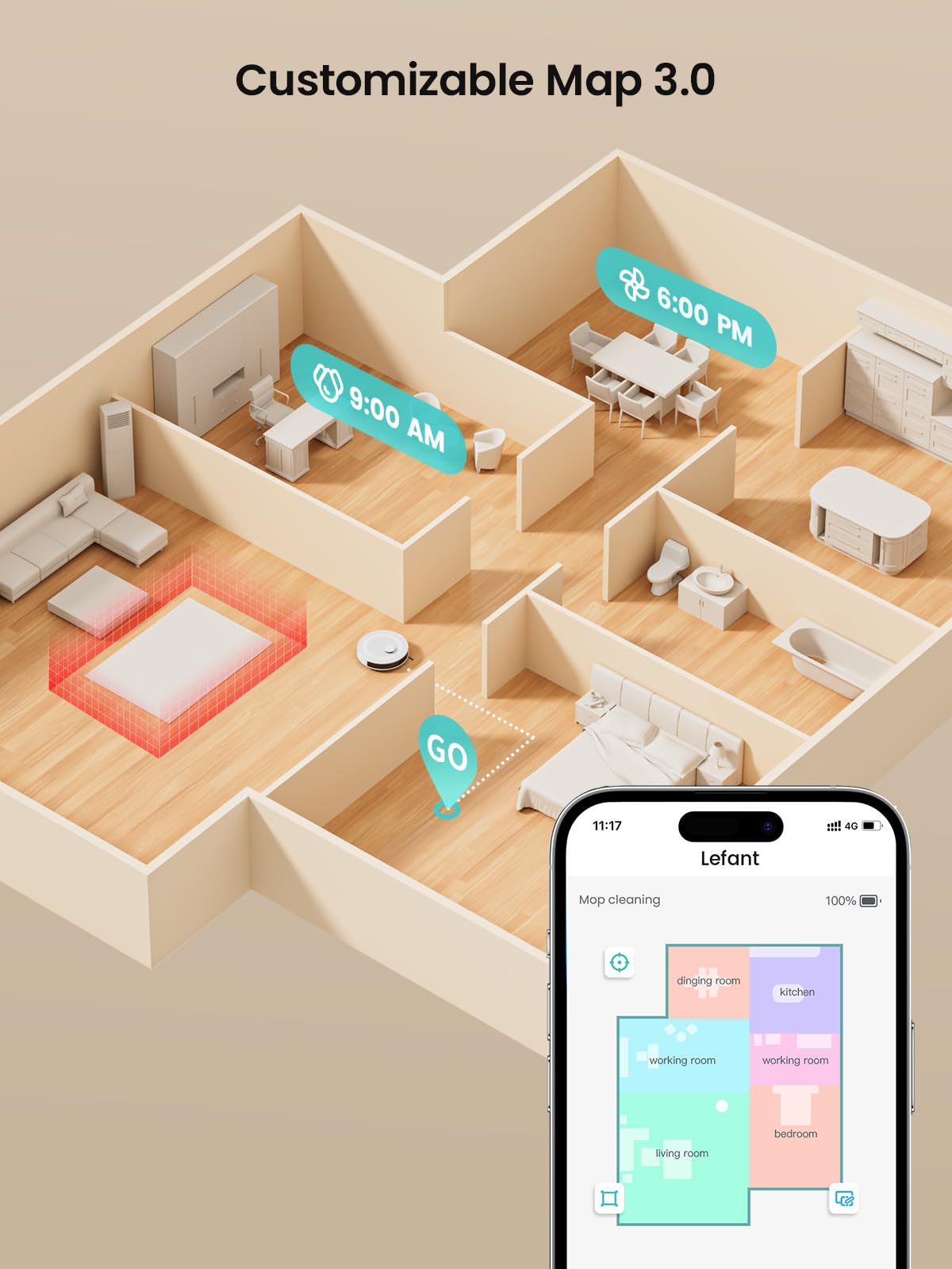 Customizable Cleaning: Use the Lefant app to set room-specific schedules, targeted cleaning zones, and personalized cleaning plans.
