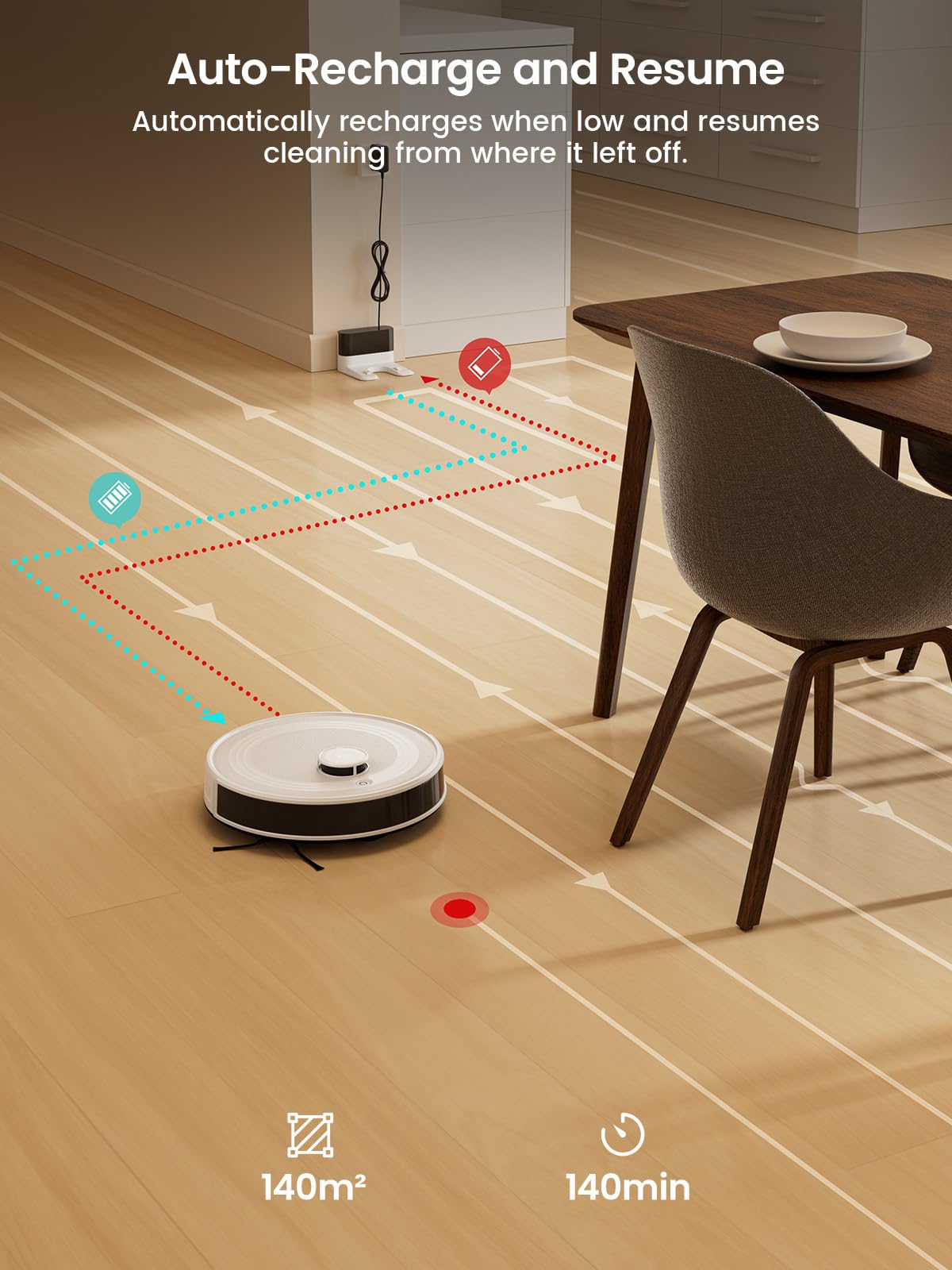 Extended 140-Minute Runtime: Covers large areas on a single charge and automatically returns to its dock when finished.